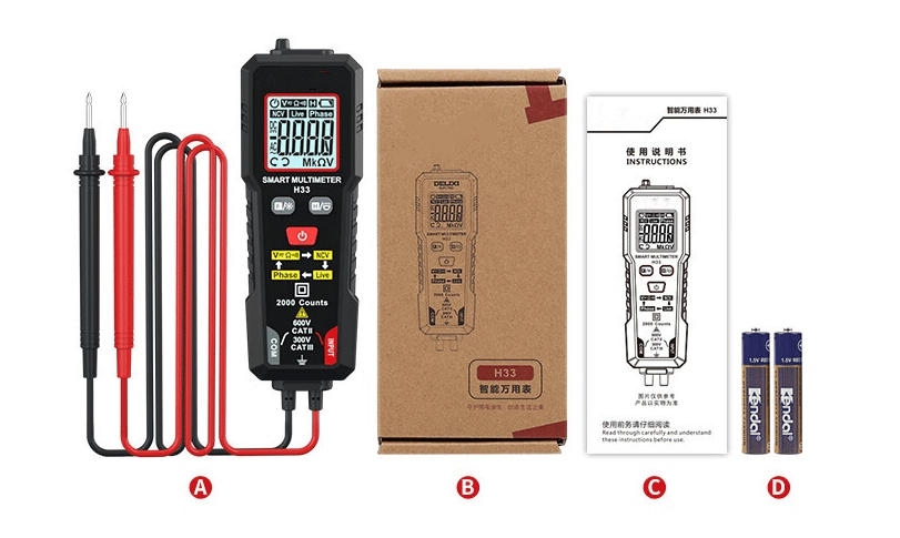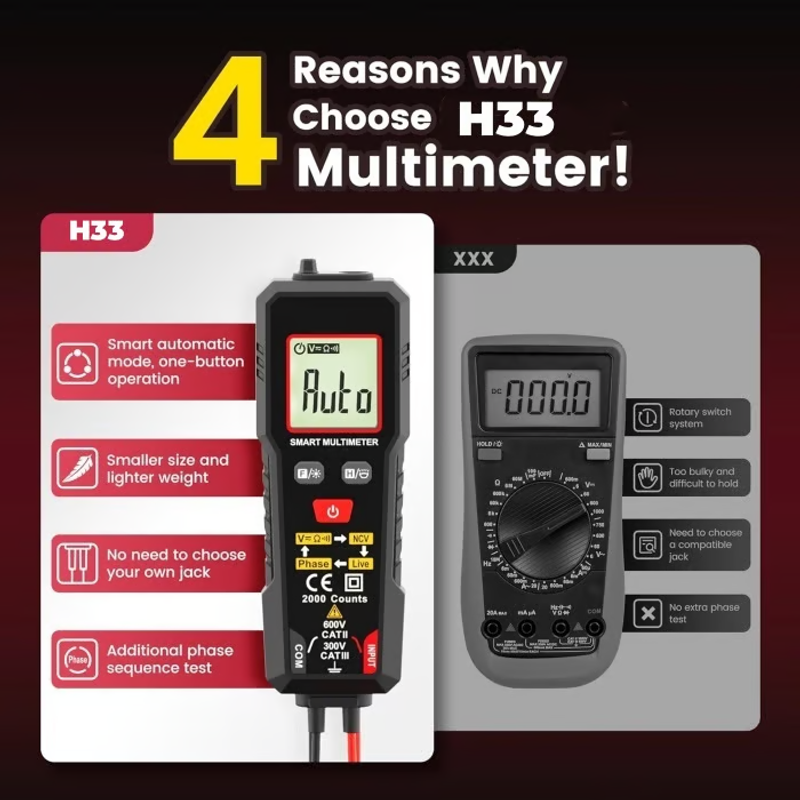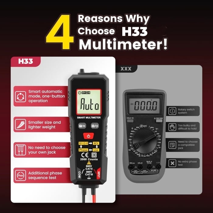 H33 voltmeter supports data retention, smart mode, NCV, and live wire measurement functions. It can measure AC/DC voltage, resistance, continuity, and phase. This multimeter tester is widely used in electrical testing, household, automotive, and industrial electrical